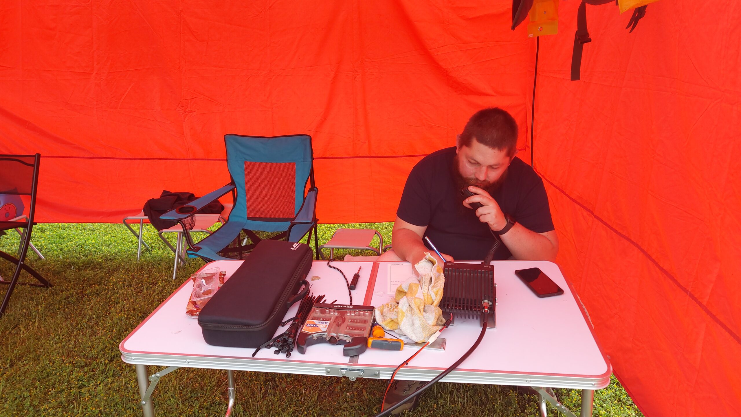 Namiot klubowy bardzo dobrze się sprawuje. W tle widać maszt z anteną X510 oraz z tyłu antena KF endfed.